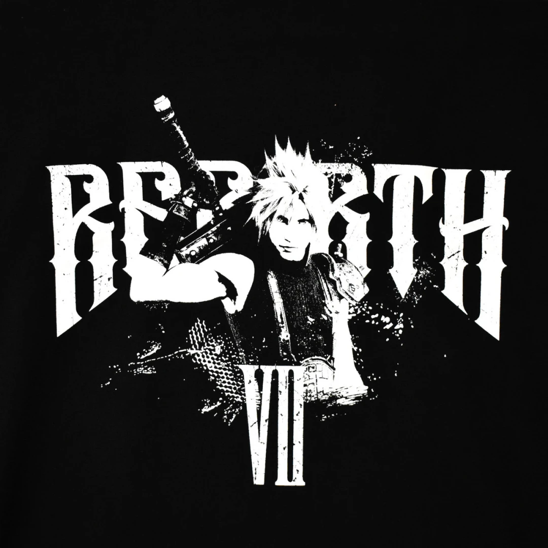 – Design: Cloud Strife met Buster Sword over stylized "REBIRTH" font.