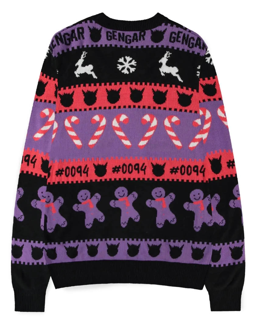 Dit opvallende ontwerp, gemaakt van volledig jacquardbreisel, plaatst Gengar centraal, omringd door een ondeugende mix van peperkoekenspoken, zuurstokken, Pokédex-nummers en duistere iconen.