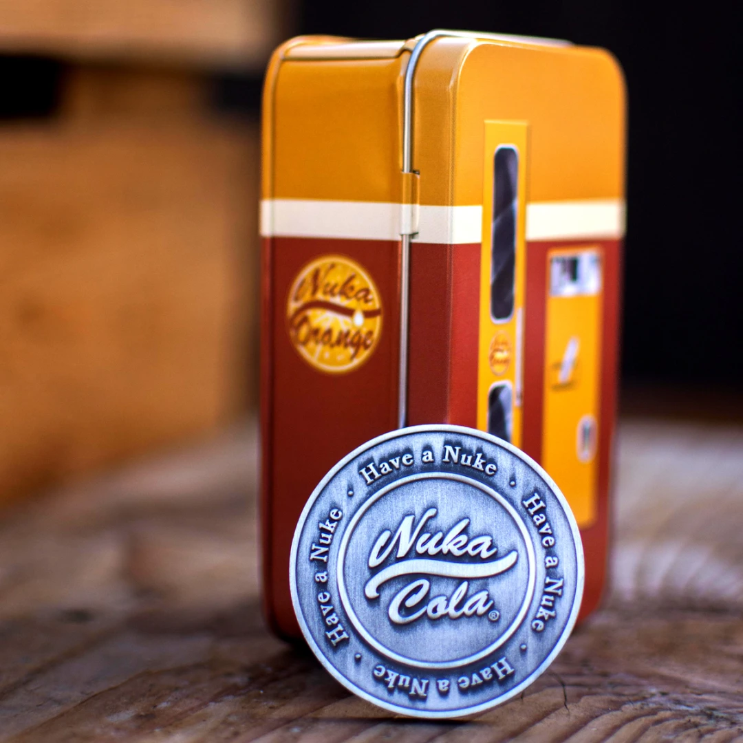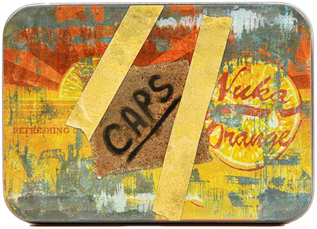 – Caps Tin Box & Caps: Een Caps Tin Box (10 x 7 x 4 cm) gevuld met 30x Nuka-Cola Bottle Caps van Tinplate (elk 2.6 x 0.5 cm).