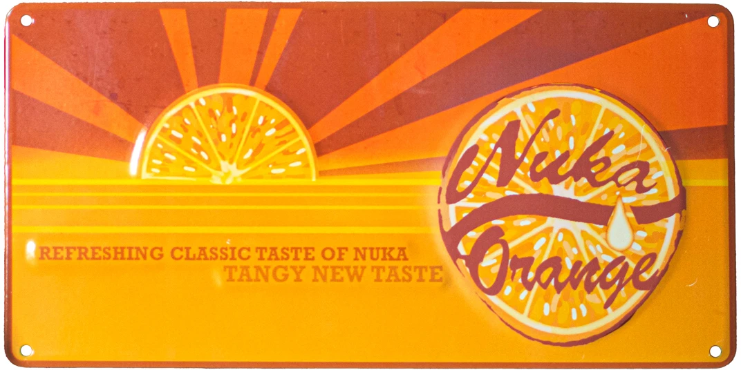 – Tin Sign: Een robuust Tin Sign (25.4 x 12.7 cm) met UV printing en embossed details van Nuka-Orange artwork.