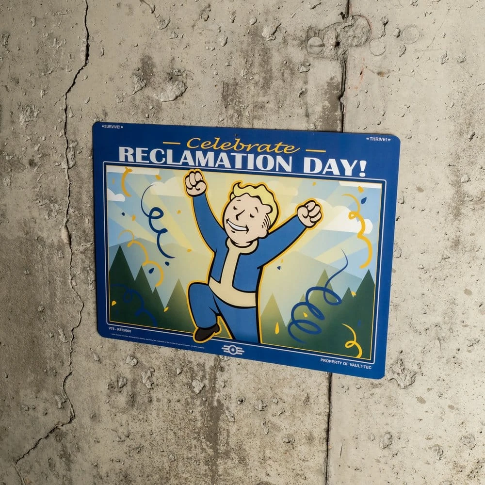 Dit metalen bord toont de Reclamation Day-theme uit de Fallout-serie en is vervaardigd uit duurzaam metaal. Dankzij het lichte gewicht en de stevige constructie is het eenvoudig op te hangen of tentoon te stellen als verzamelitem.