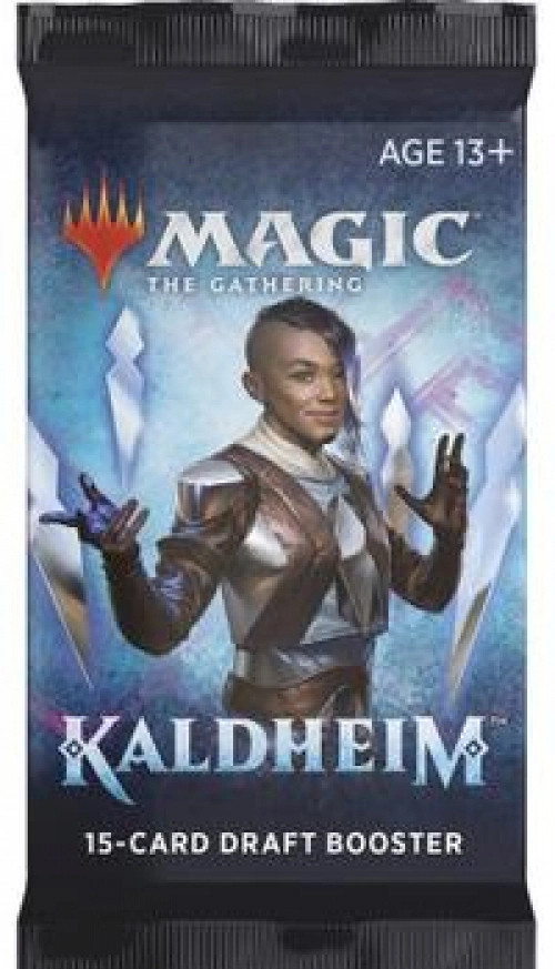 Een Booster Draft Pack van Kaldheim bestaat uit 15 kaarten waarvan 1 rare, 3 uncommons, 10 commons, 1 basic land