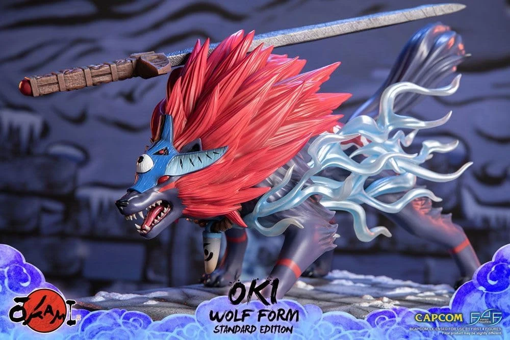 Oki in zijn Wolf Form verschijnt hier als een krachtige resin statue van First 4 Figures, gebaseerd op de iconische kunststijl van Okami. In deze vorm strijdt Oki zij aan zij met Amaterasu om Nippon te beschermen tegen demonische dreigingen. Het ontwerp blijft trouw aan zijn verschijning in de game: felle rode ogen, ruige vacht, ijzige blauwe vlammen die om zijn lichaam draaien en de legendarische Kutone op zijn rug. De dynamische pose en de koude sfeer van Kamui geven deze statue een indrukwekkende, spirituele uitstraling.