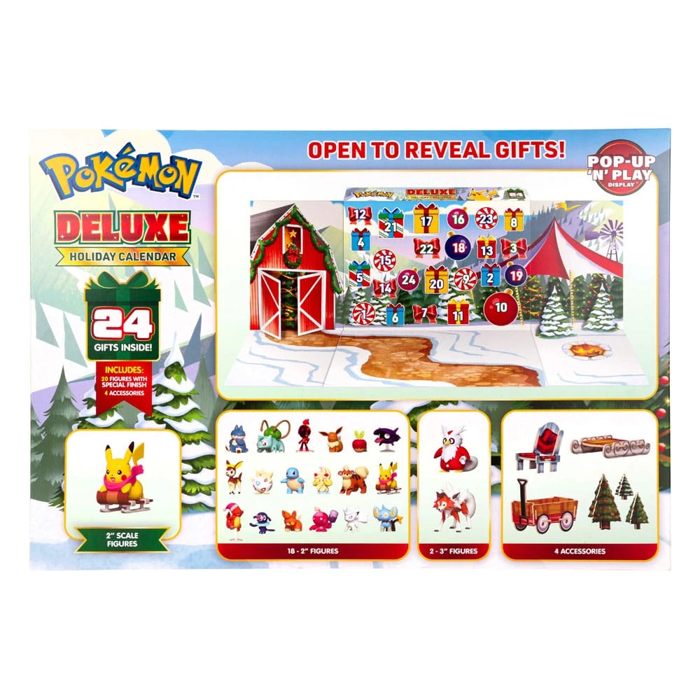 De Pokémon Deluxe Holiday Advent Calendar is de perfecte manier om de feestdagen te vieren! Tel de dagen af met een dagelijkse verrassing en ontdek een cool speelveld. De kalender ontvouwt zich tot een spectaculaire speelscène waar je jouw Pokémon-avontuur kunt uitbreiden. Onthul elke dag een nieuwe figure of accessoire en breid je winterse Pokémon-wereld uit!