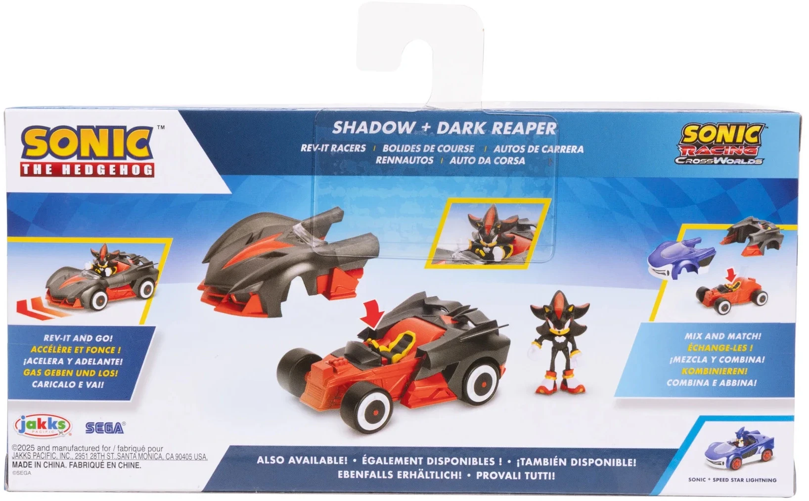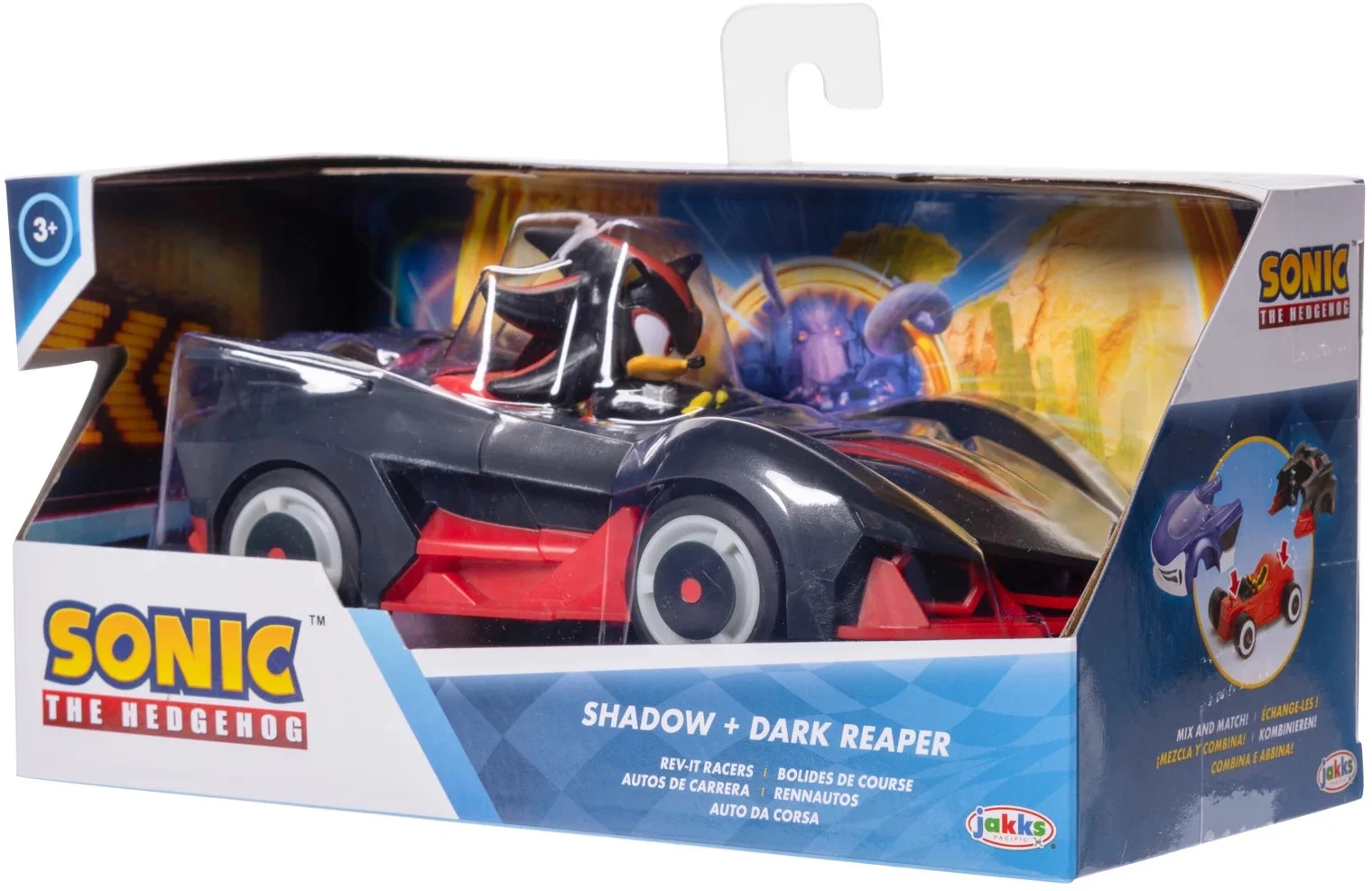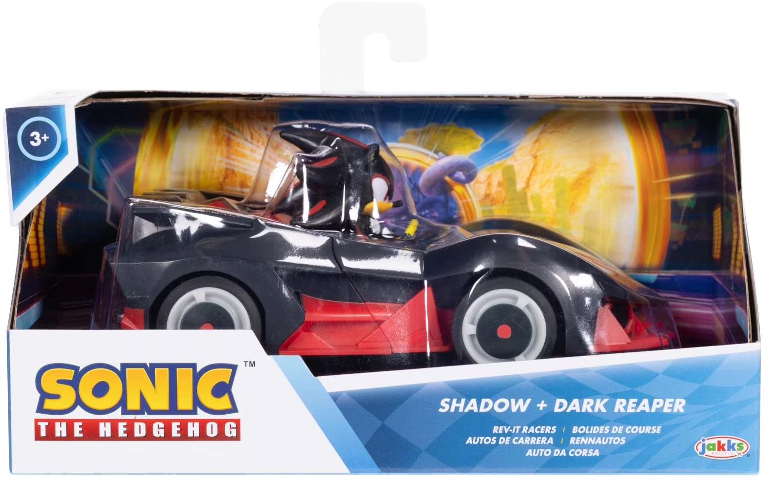 Bereid je voor op een onvergetelijke rit met deze Shadow the Hedgehog Rev-It Racer. Plaats Shadow in zijn indrukwekkende Dark Reaper-racewagen, trek hem naar achteren en laat hem los om hem razendsnel weg te zien scheuren. De racewagen is ca. 15 cm lang en perfect om te combineren met andere Rev-It Racers (apart verkrijgbaar) voor je eigen ultieme race.