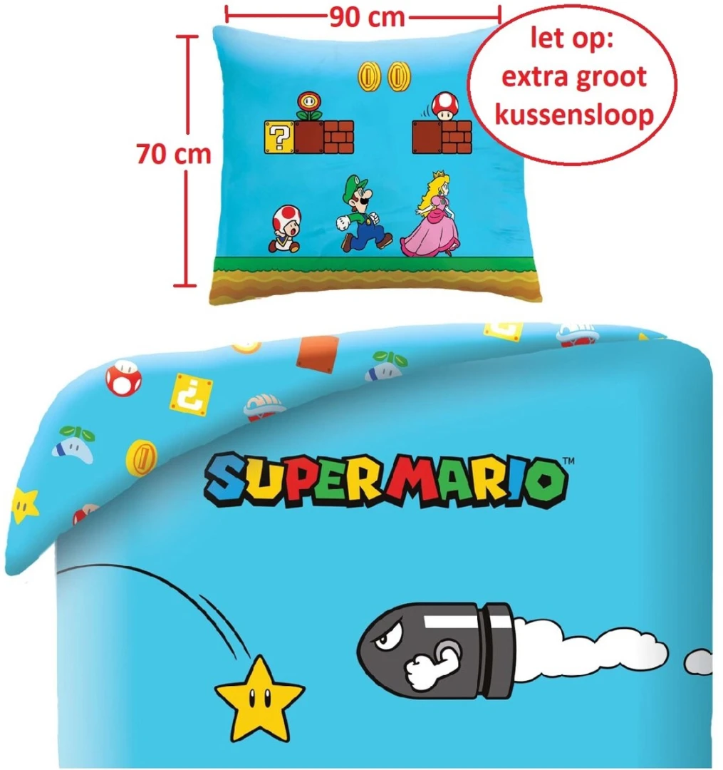 Breng de vrolijke wereld van Super Mario naar de slaapkamer met dit kleurrijke dekbedovertrek. Met zijn iconische personages en herkenbare stijl voelt elke nacht als een nieuw avontuur in het Mushroom Kingdom. Perfect voor fans die zelfs tijdens het slapen geen afscheid willen nemen van hun favoriete gameheld.