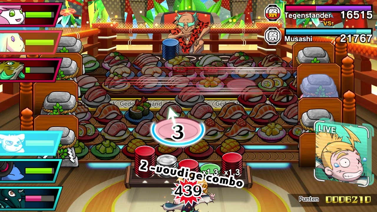 Maak stapels borden met dezelfde kleuren en dezelfde soort sushi, en gooi ze naar je tegenstander. Hoe hoger je stapel is, hoe krachtiger je aanval wordt.