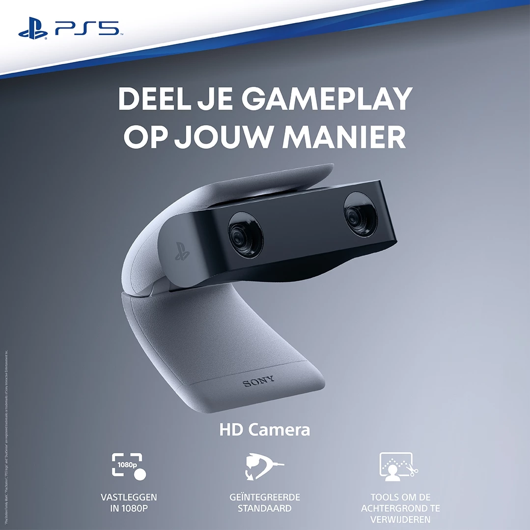 Met dubbele lenzen voor 1080p-opname en een ingebouwde standaard, werkt de HD-camera naadloos samen met de PS5 ™ -tools voor het verwijderen van de achtergrond om je in de schijnwerpers te zetten. Maak snel een opname of uitzending van uzelf en uw gameplay met de knop Create* van uw DualSense ™ draadloze controller.
