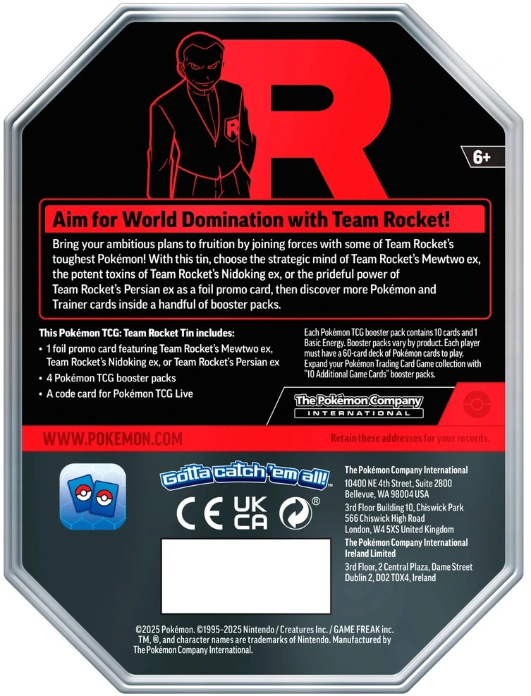 Kies voor stijl én kracht met Team Rocket’s Persian ex! In deze tin vind je een schitterende folie promokaart van Persian ex, een symbool van elegantie en meedogenloze aanvallen. Daarnaast krijg je meerdere boosterpakketten vol nieuwe mogelijkheden voor je deck.