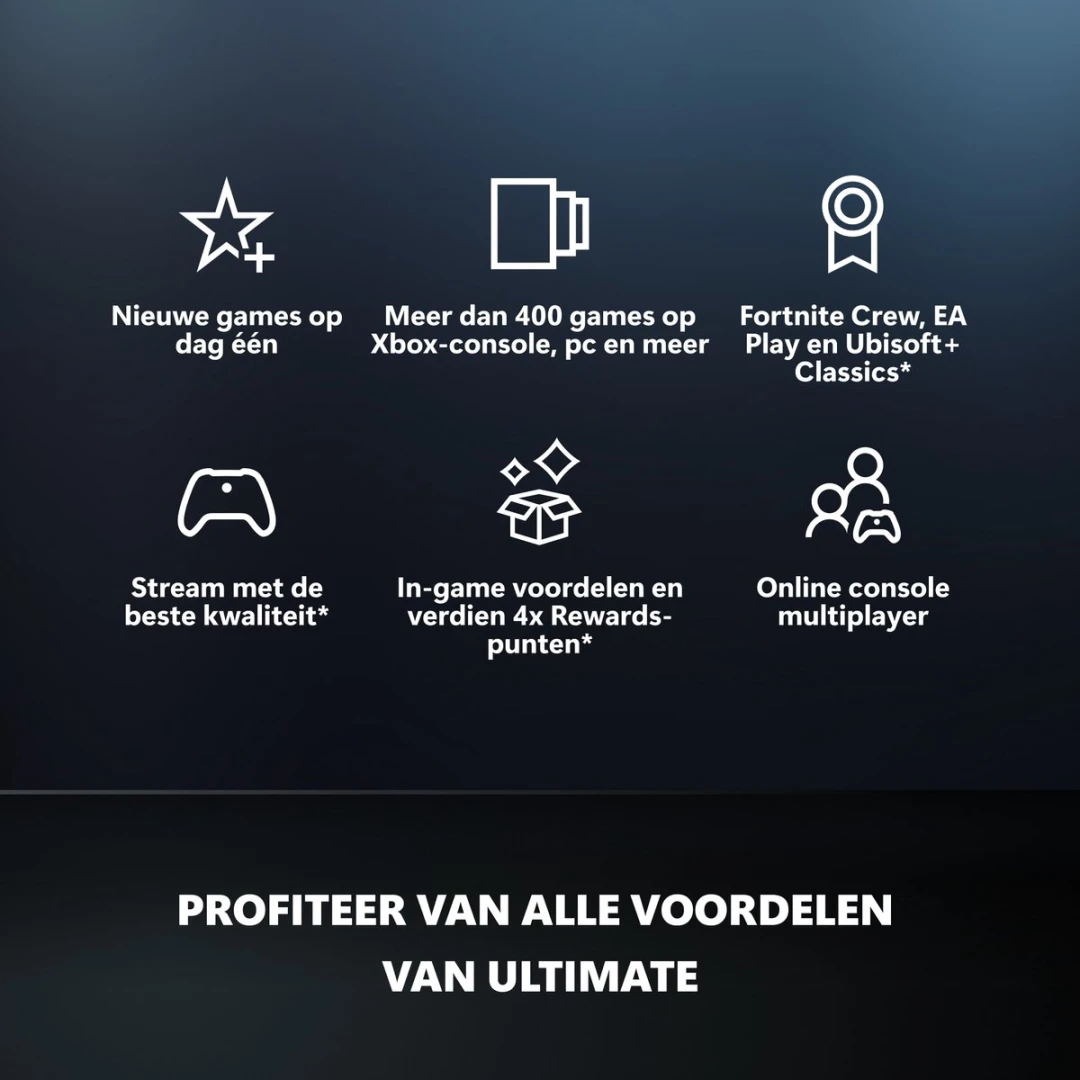 Speel Call of Duty: Black Ops 7, High on Life 2* en meer nieuwe games vanaf dag één op elk scherm. Kies uit een bibliotheek met meer dan 400 games, zoals The Outer Worlds 2, Hollow Knight: Silksong en Grounded 2. Duik in een reeks legendarische franchises, van Call of Duty® tot Minecraft en alles daartussenin. Download games en speel op Xbox-console, pc en ondersteunde handhelds. Sla het downloaden over en stream games (inclusief geselecteerde games die van jou zijn) op elk ondersteund apparaat, waaronder mobiele apparaten, tablets, tv's en VR-headsets. Met Xbox Game Pass Ultimate krijg je de beste streamingkwaliteit met de kortste wachttijden via cloud gaming.* Krijg in-game voordelen in de populairste games, zoals League of Legends, Call of Duty: Warzone en Rainbow Six Siege. Ontdek favorieten zoals EA SPORTS FC, The Sims, STAR WARS™ en andere fanfavorieten met EA Play. Ontdek meer dan 50 iconische games uit enkele van de meest memorabele franchises in de gamegeschiedenis met Ubisoft+ Classics. Krijg toegang tot de Fortnite Battle Pass, maandelijks 1.000 V-Bucks en meer met Fortnite Crew.* Geniet van online console multiplayer, kortingen voor games, partnervoordelen en meer. Speel en verdien tot 100.000 punten per jaar in de Store met Rewards.* Krijg tot 30% korting op geselecteerde games uit de Xbox Game Pass-bibliotheek en verdien nog meer van je favoriete dingen met Ultimate.* Vind jouw community met Xbox en speel waar je wilt.*